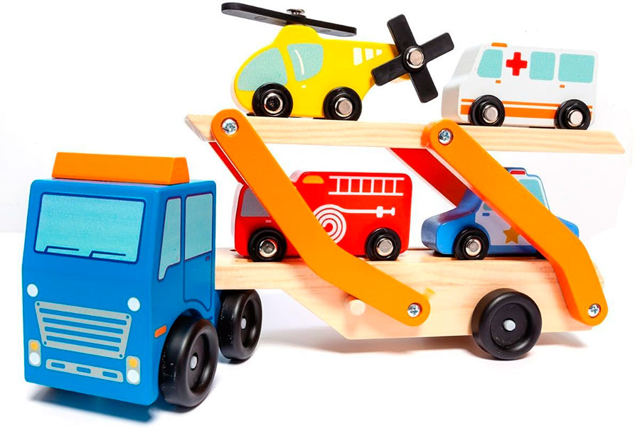 Vehículo de emergencia de madera natural que incluye un coche patrulla, un camión de bomberos, una ambulancia y un helicóptero.