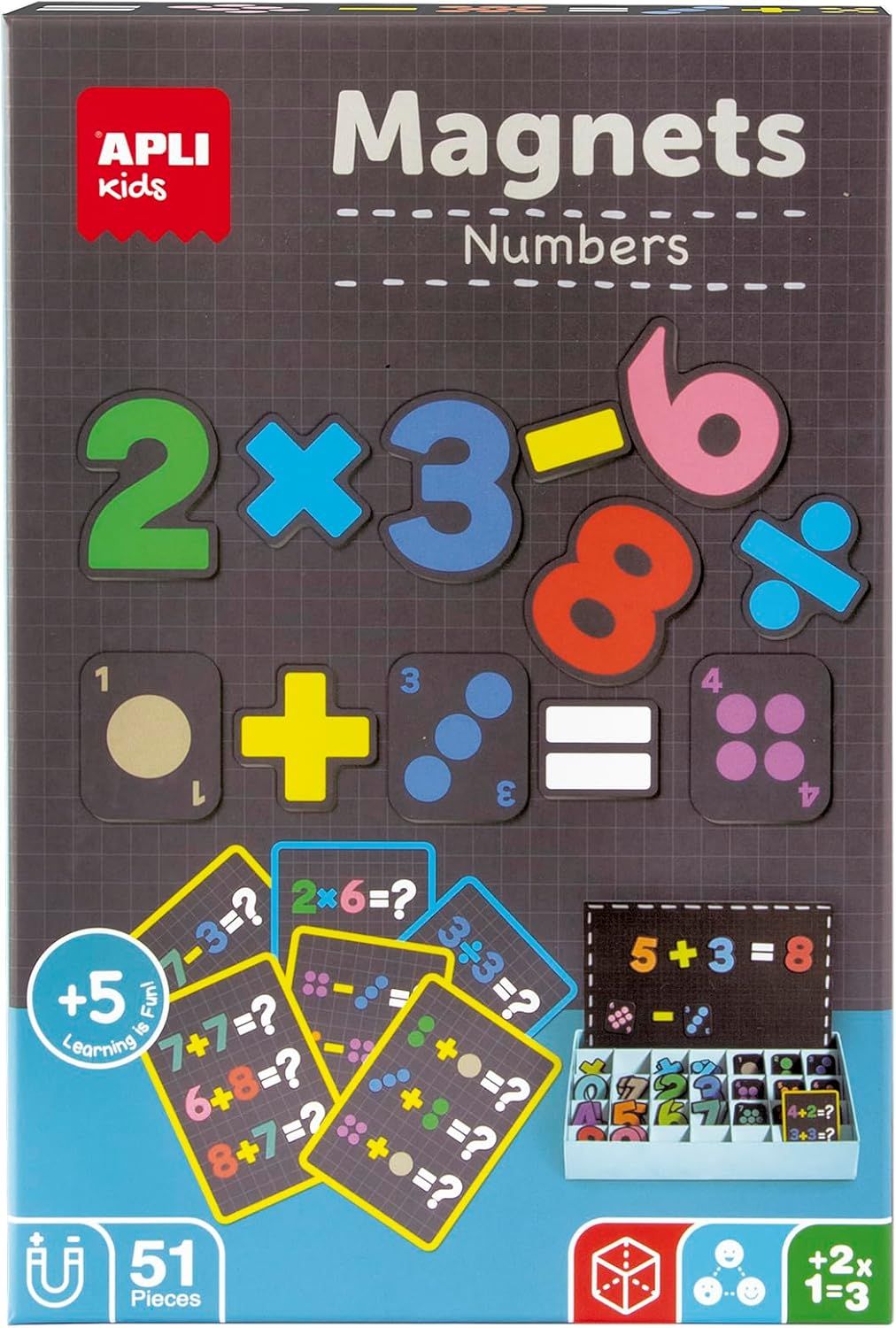 Juego educativo de 51 imanes para iniciar al niño/a en las matemáticas. Con pizarra y caja compartimentada para ordenar los números y símbolos. Incluye 15 tarjetas con diferentes niveles de dificultad.