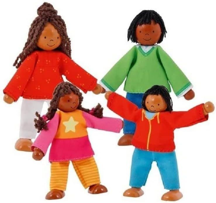 Familia de muñecas plegables con un niño y una niña: las figuras de madera, son fácilmente movibles y pueden estar tanto de pie como sentadas. Fomenta la creatividad y el juego libre y estimula la imaginación para los juegos de rol. Se imitan y practican las interacciones sociales junto a hermanos y amigos mediante la representación de escenas domésticas cotidianas.