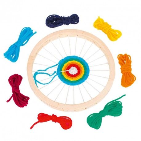 Telar redondo con distintos hilos de colores para hacer formas infinitas y únicas, con acabado redondo en cada diseño. Estructura hecha de madera resistente. Producto recomendado para los/as más pequeños/as que quieran iniciarse en el mundo de la costura.