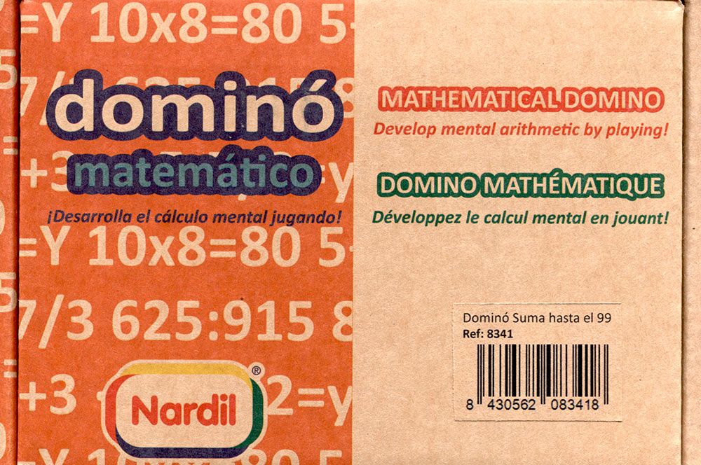 Dominó con 28 fichas lavables de plástico inyectado. Cada ficha plantea una suma en la derecha y en la izquierda muestra el resultado de otra suma en un color diferente.